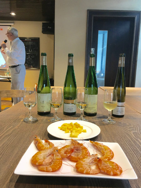 当天一共品尝了阿尔萨斯的4款白葡萄酒:灰皮诺、老藤琼瑶浆、晚收琼瑶浆、雷司令。
