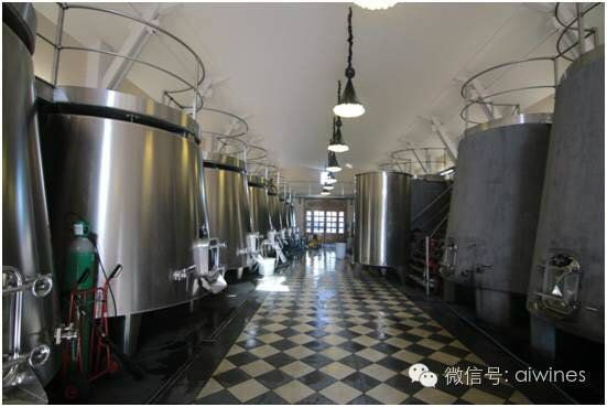 接下来的酿造车间,一组组巨型发酵罐整齐矗立其中,分不锈钢和水泥两种材质。Augestin先生介绍:两种材质的发酵罐生产出的葡萄酒香气、口感有差别,经过调配后可使酒更复杂圆润。