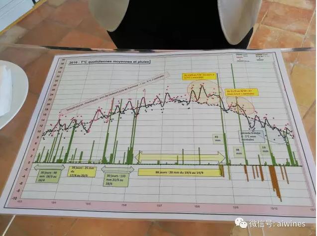 2016的春季气温相对比较温暖而且多雨,降水量达到将近300多毫米,接近往年一年的降水量。但是,到了夏季却是一个干燥夏季,整个7月、8月降雨只有8毫米,以致8月葡萄停止了生长。庆幸的是9月13日迎来了近50毫米左右的降水,称得上及时雨。在之后的日子里,9月下旬白天气温很高,夜晚冷,昼夜温差大,能使葡萄的酸度与香气很好的平衡。